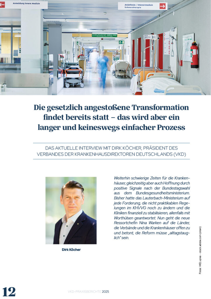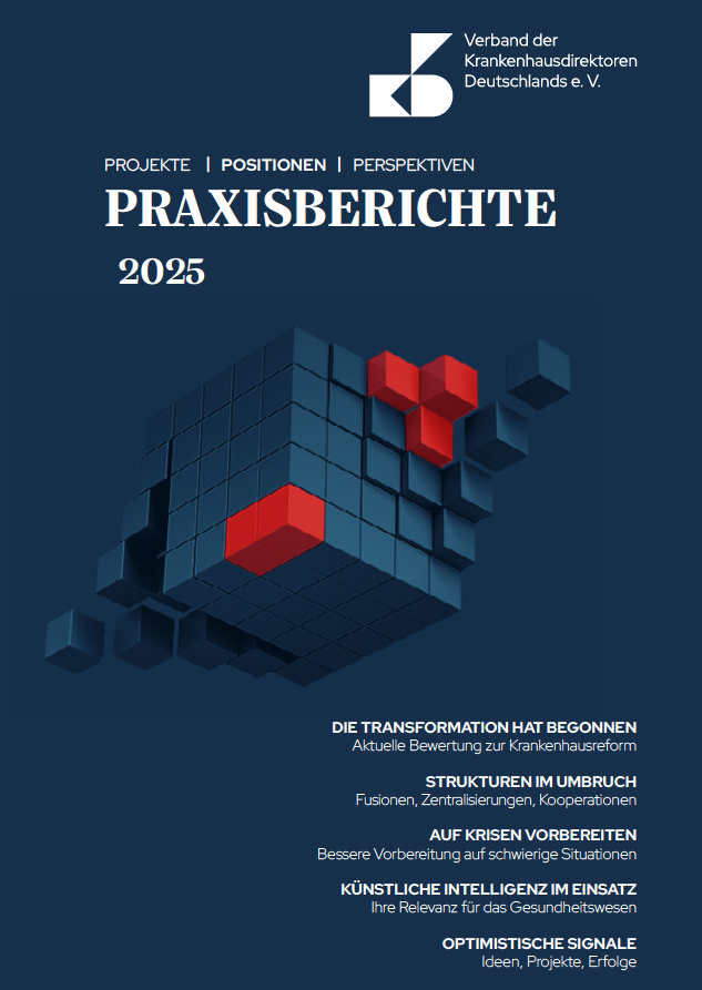 Jährlich erscheinen die VKD-Praxisberichte. Unsere Mitglieder verdeutlichen hier die Sicht der Praktiker. Berichtet wird direkt von der Basis zu Fragen des Krankenhausmanagements. Es wird anhand von Projekten, Positionen und Perspektiven gezeigt, wie Prozesse organisiert, gute Ideen umgesetzt und Kooperationen gelebt werden.